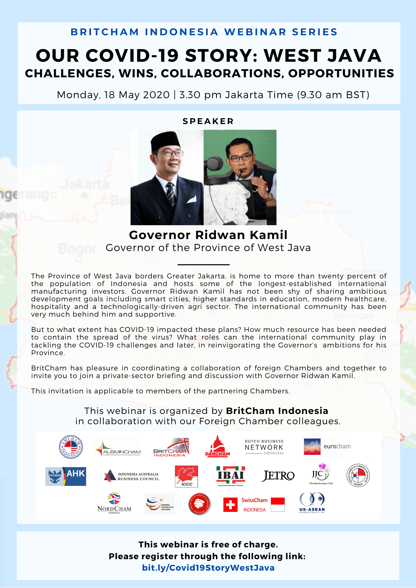 Our colleague at BritCham Indonesia has the pleasure in coordinating a collaboration of foreign Chambers and together to invite you to join a private-sector briefing and discussion with Ridwan Kamil, Governor of West Java.