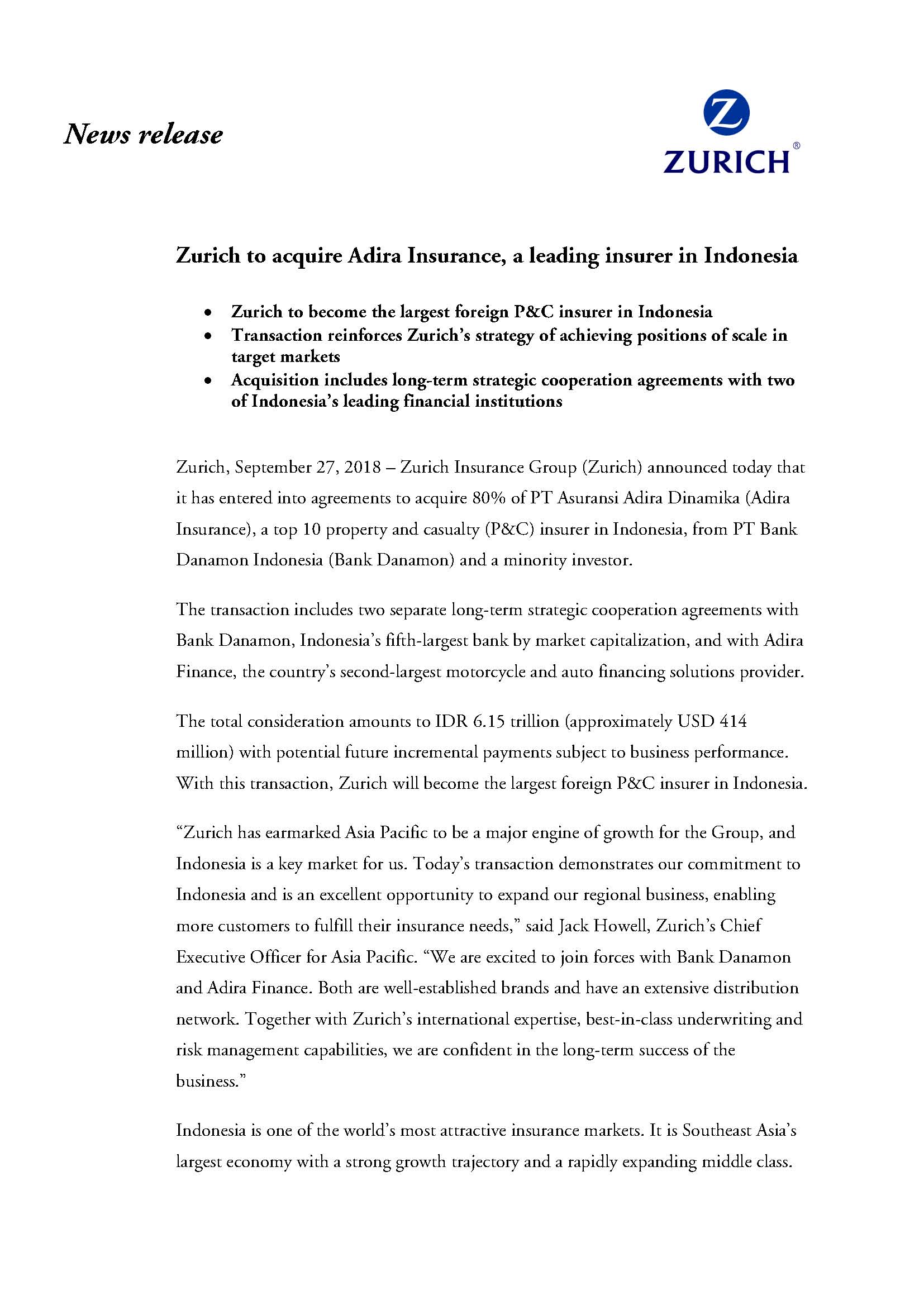 Zurich Insurance Group (Zurich) announced today that it has entered into agreements to acquire 80% of PT Asuransi Adira Dinamika (Adira Insurance), a top 10 property and casualty (P&C) insurer in Indonesia, from PT Bank Danamon Indonesia (Bank Danamon) and a minority investor.
